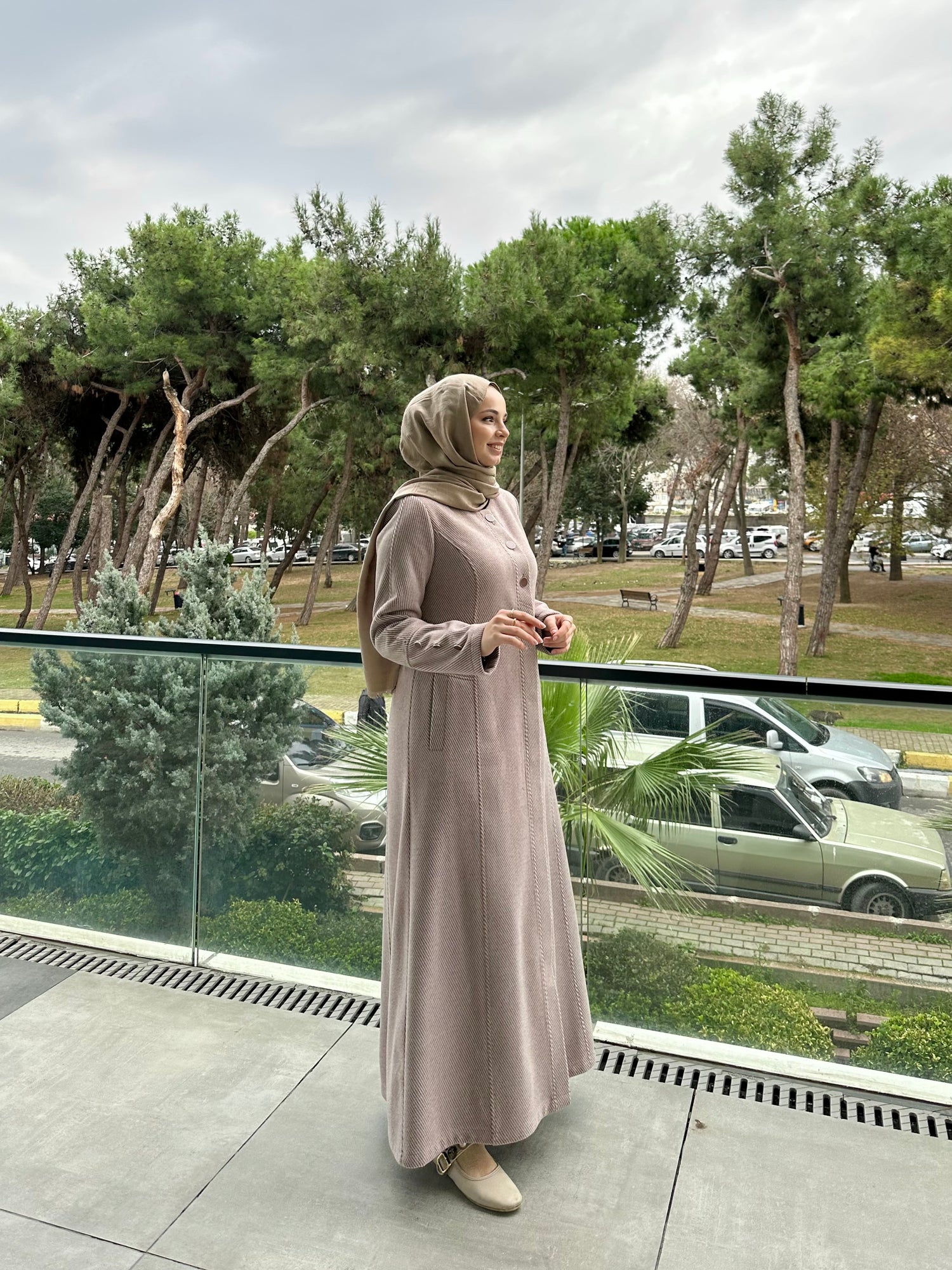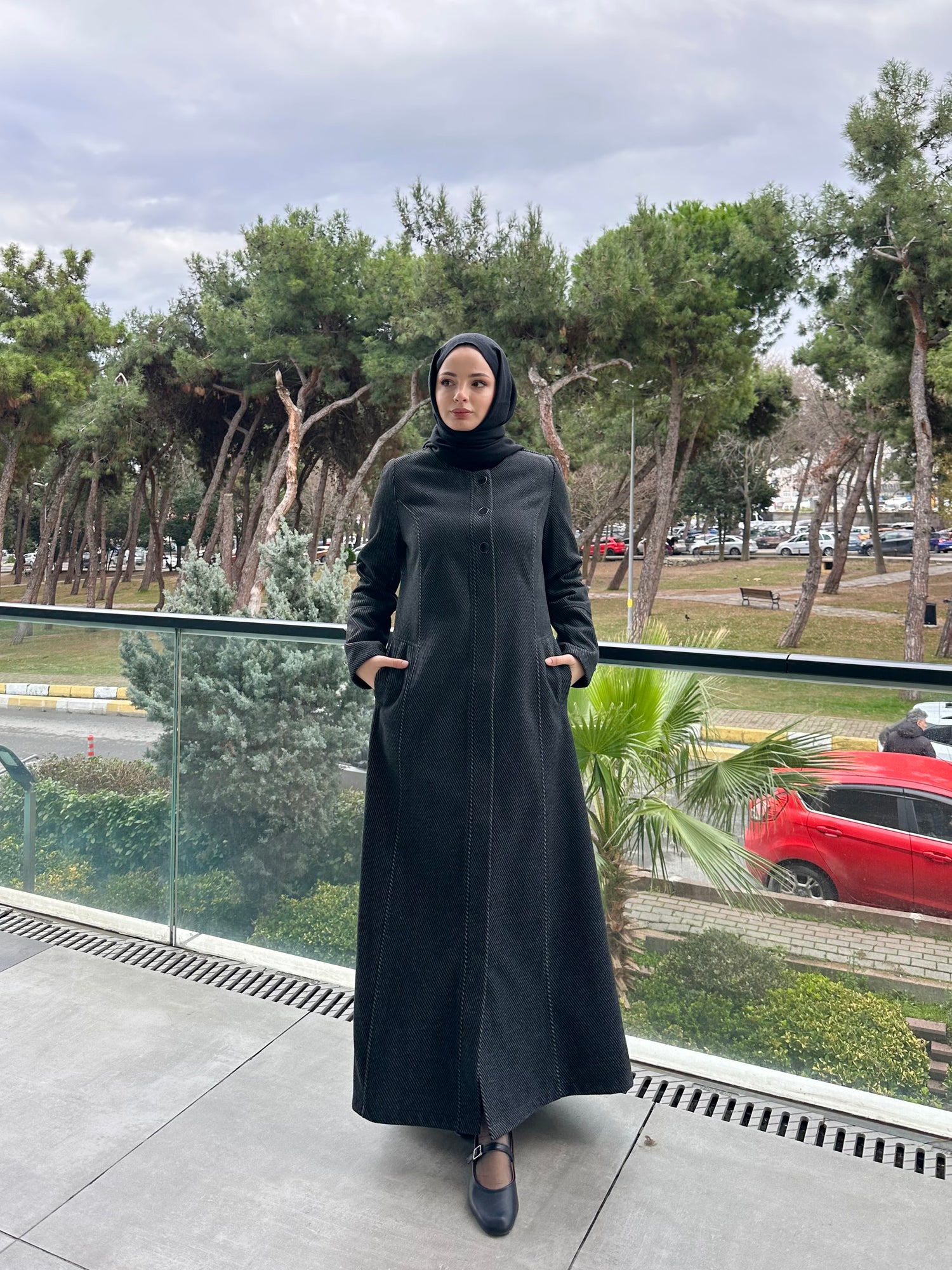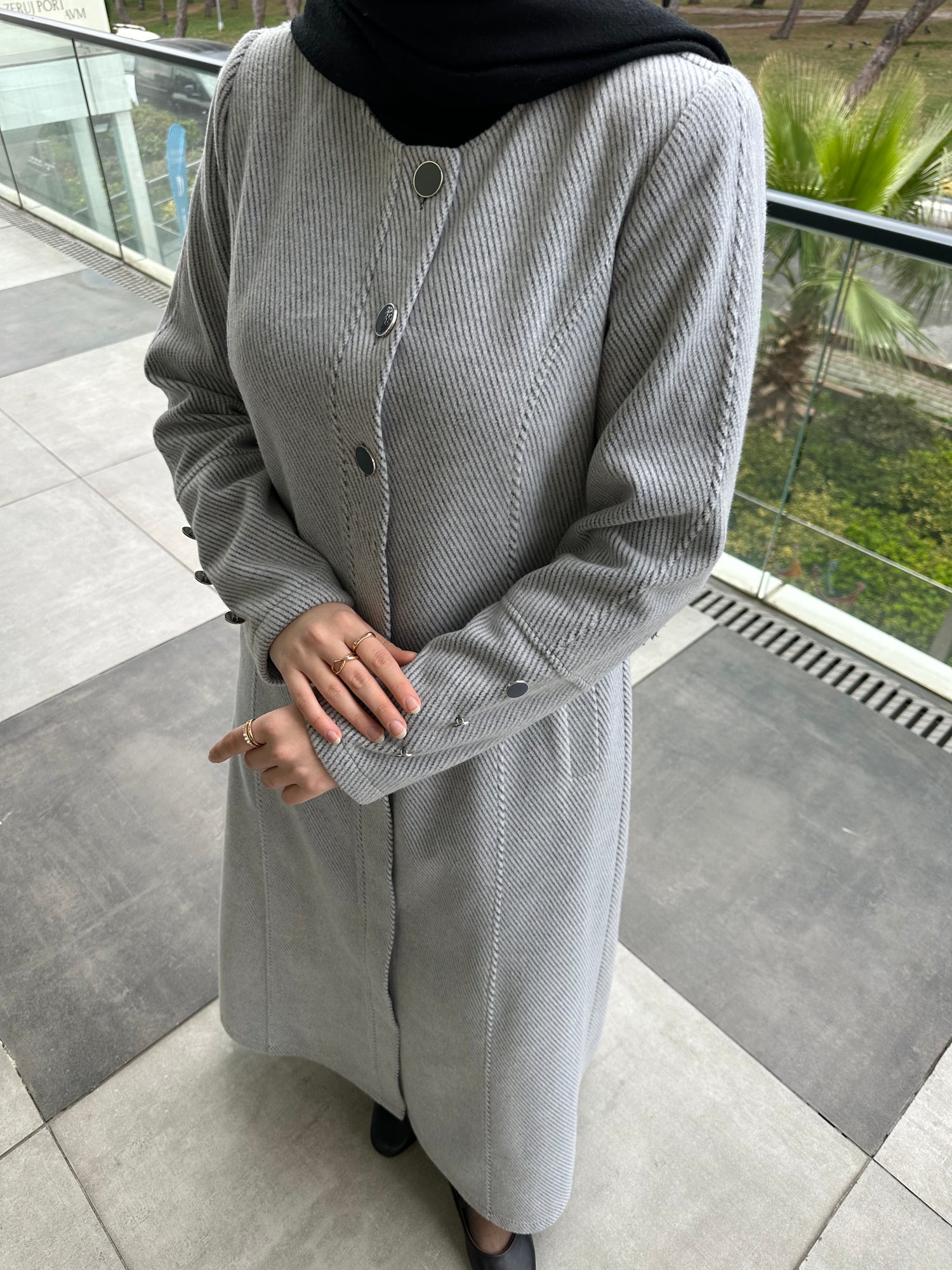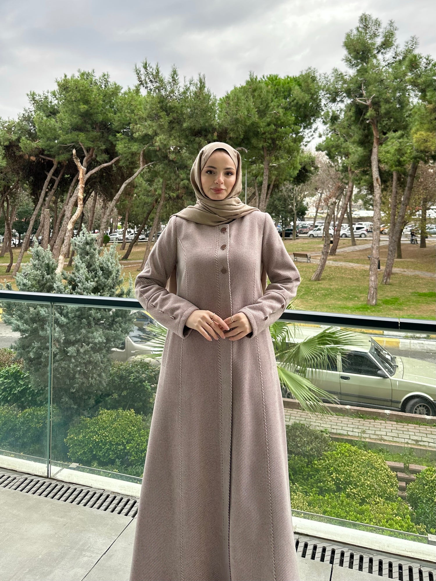 Ön ve kol kısımlarında kullanılan özel mineli düğmeler, modele modern ve sofistike bir görünüm kazandırır. Cep üstlerinde yer alan modern kesik detayları tasarımı hareketlendirirken, kuplu kalıbı vücuda oturan şık bir form sunar. Aşağı doğru açılan evaze kesimi ise hem rahat hareket imkânı sağlar hem de feminen bir duruş kazandırır.