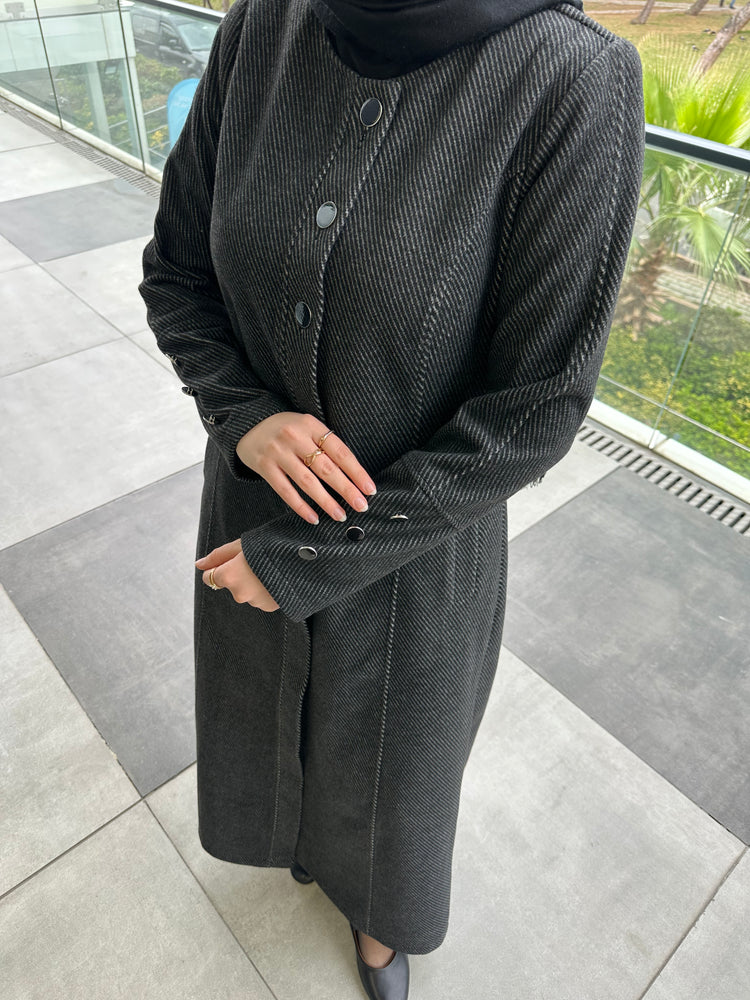 Verev çizgili kaşe kumaşıyla tok ve kaliteli bir duruş sunan bu pardösü, soğuk havalarda sıcak tutarken şıklığından ödün vermez. 143 cm boy uzunluğu sayesinde dengeli ve zarif bir siluet oluşturur.